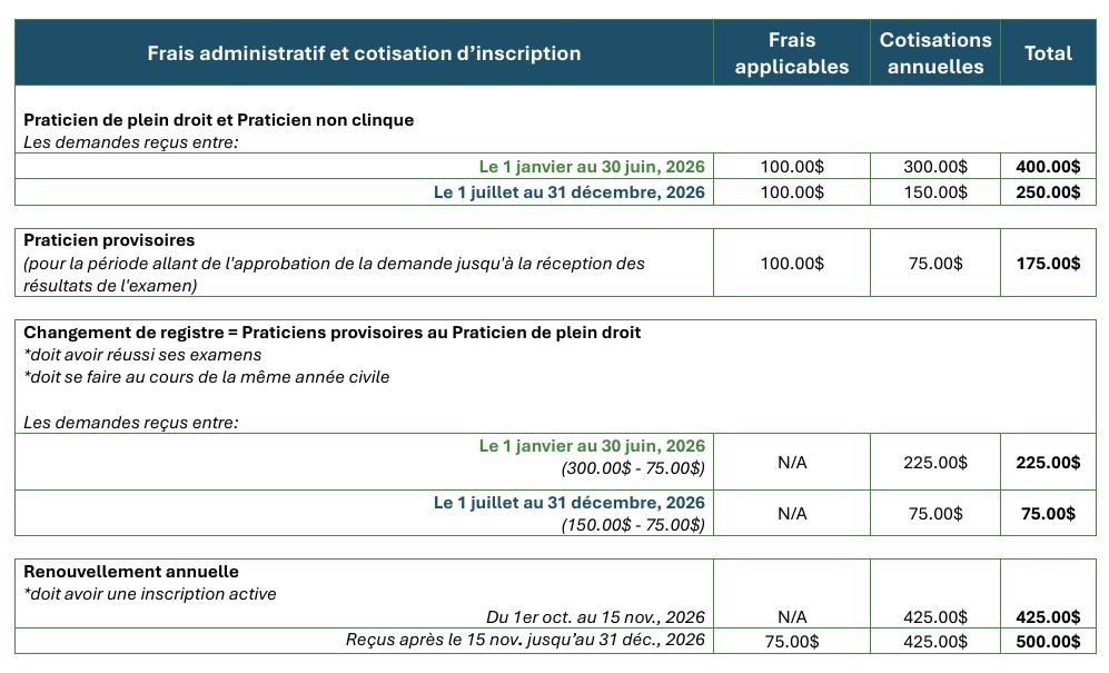 Des frais non remboursables de $100.00 doivent accompagner chaque demande d'inscription initiale. Ces frais s'ajoutent aux cotisations prescrites (le cas échéant) pour toutes les nouvelles demandes (c.-à-d. Praticien de plein droit, non-clinique, provisoire (nouveau diplômé), deuxième spécialité, transfert, etc.)