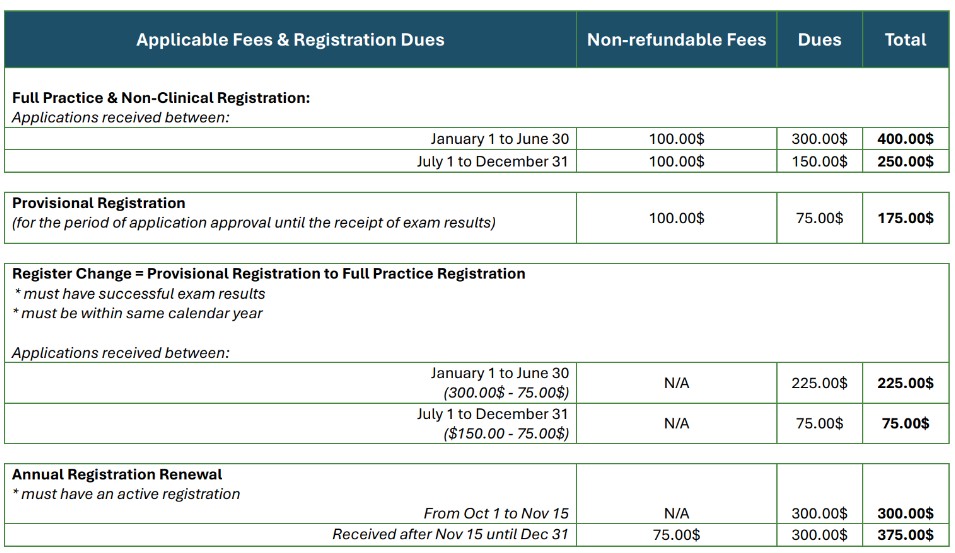 A non-refundable application fee of $100.00 must accompany each initial application for registration. Fee applied in addition to the prescribed dues (if applicable) for all new applications (i.e., Full-practice, Non-clinical, Provisional (new graduate), Second specialty, Transfer in province, etc.)